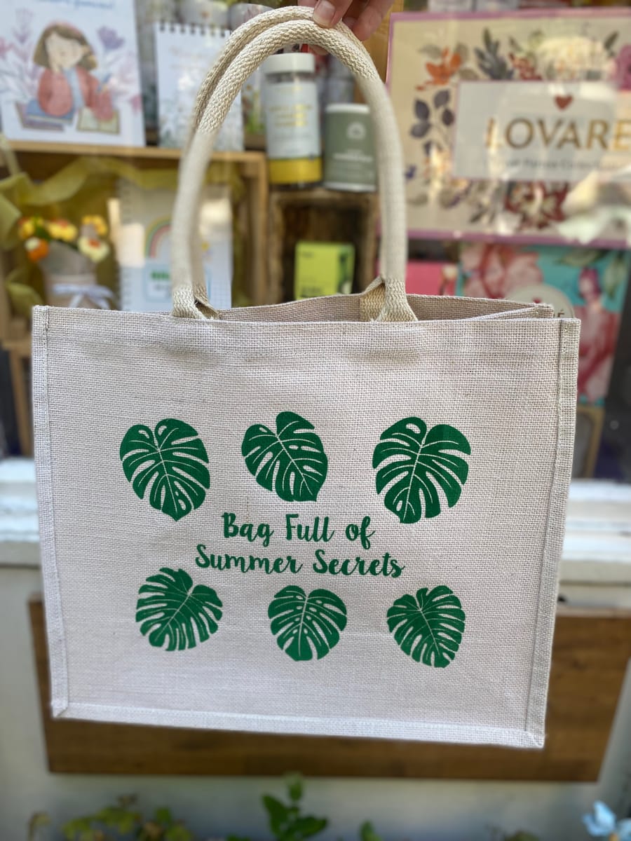 Изберете между два вдъхновени от природата дизайна – ярки портокали или свежи листа – и внесете настроение в ежедневието си. Надписът "bag full of summer secrets" е фин акцент, който превръща чантата в истински летен спътник – идеална за плаж, пикник, пазар или градски разходки.