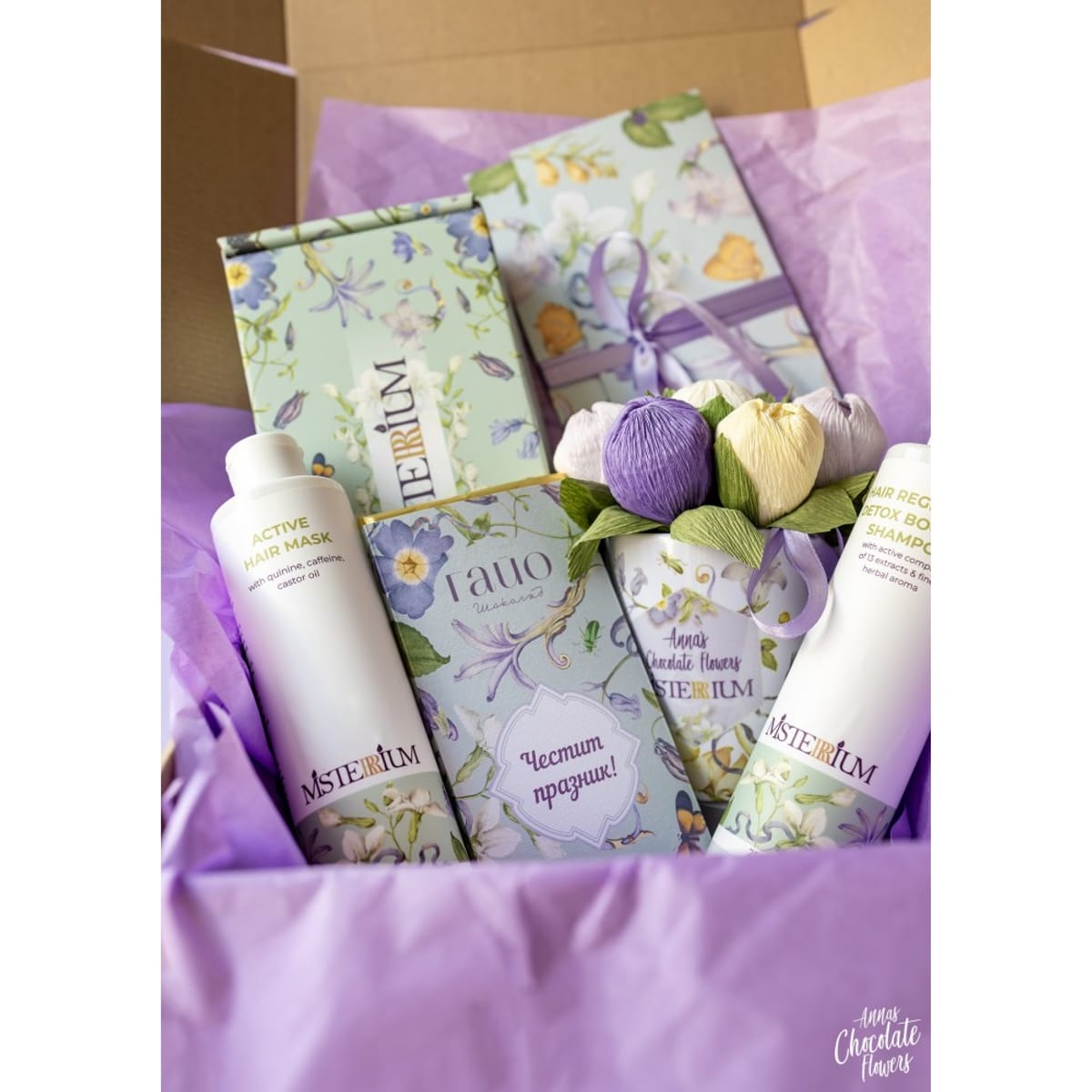 СЪДЪРЖАНИЕ : -Комплект шампоан и маска за коса MISTERRIUM -Шоколадова картичка ГАЙО с лично послание -Букет цветя с шоколадови Трюфели в чаша -Картичка-плик със сатенена панделка с лично послание